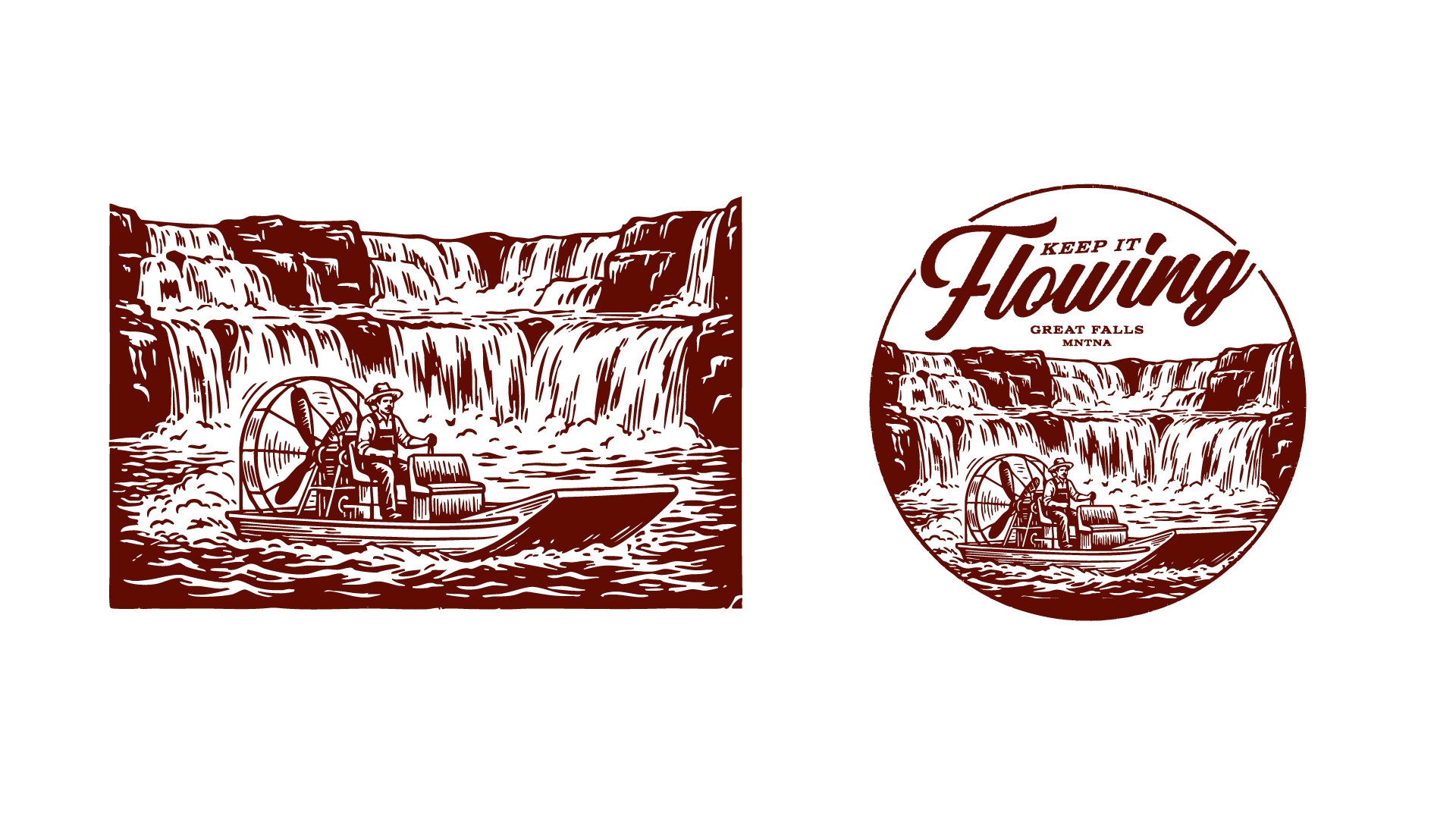 A brand needs more than a logo to tell a full story. We developed a suite of woodcut-style illustrations to expand the visual vocabulary. The hero illustration depicts a steamboat navigating the falls with the text "Keep It Flowing." This image specifically ties the water-based culture of the bayou to the waterfalls of Montana.
