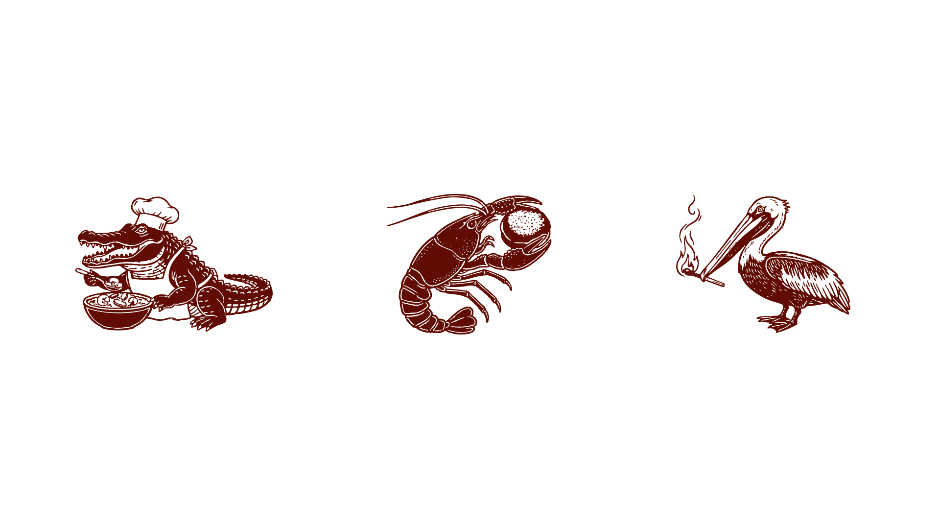 We added the character of the alligator chef to inject humor and personality. The crawfish illustration serves as a nod to the staple ingredient of the cuisine. These illustrations appear on coasters, menus, and apparel. They add texture and history to the visual identity. They make the brand feel lived-in and authentic.