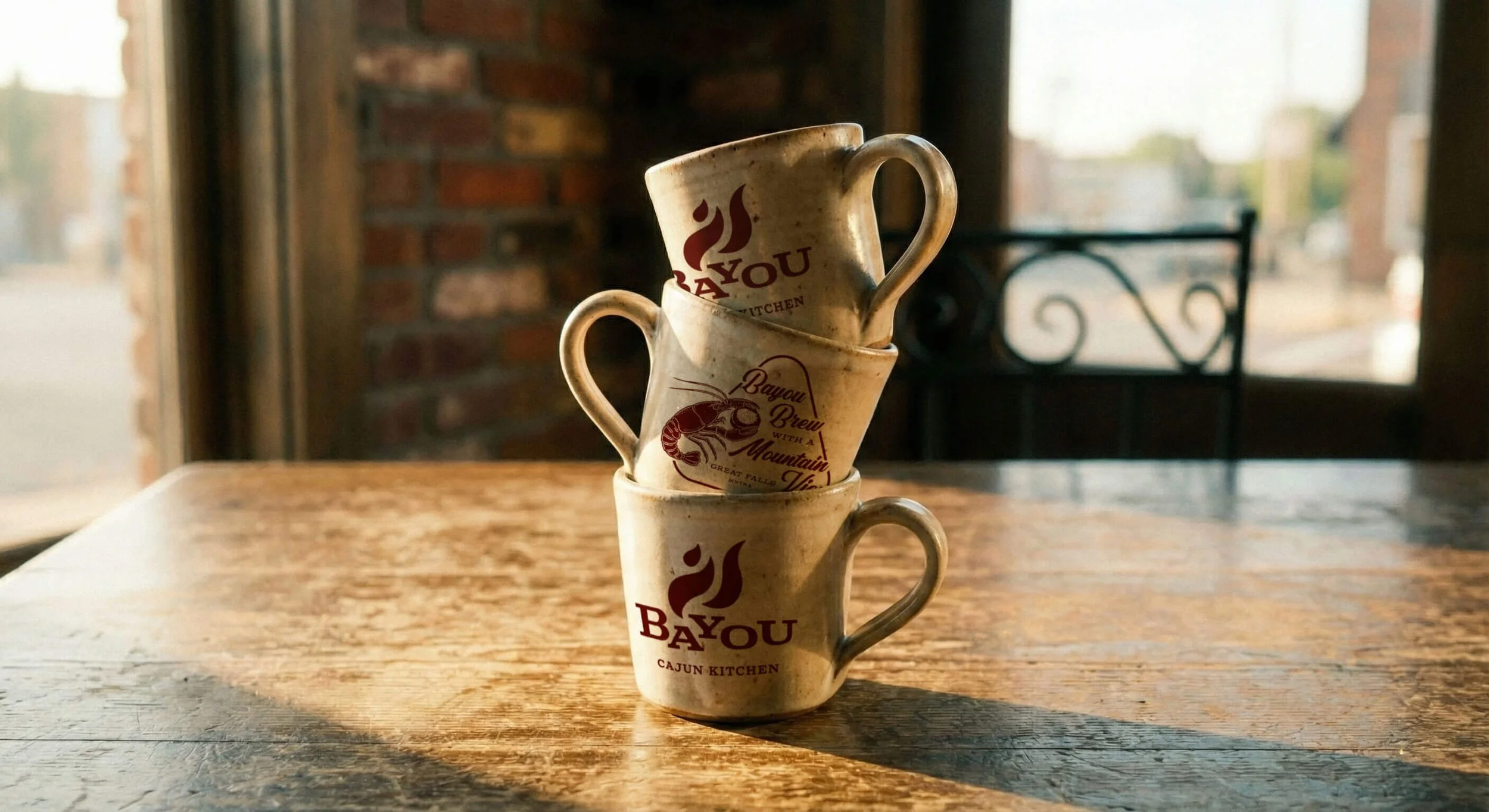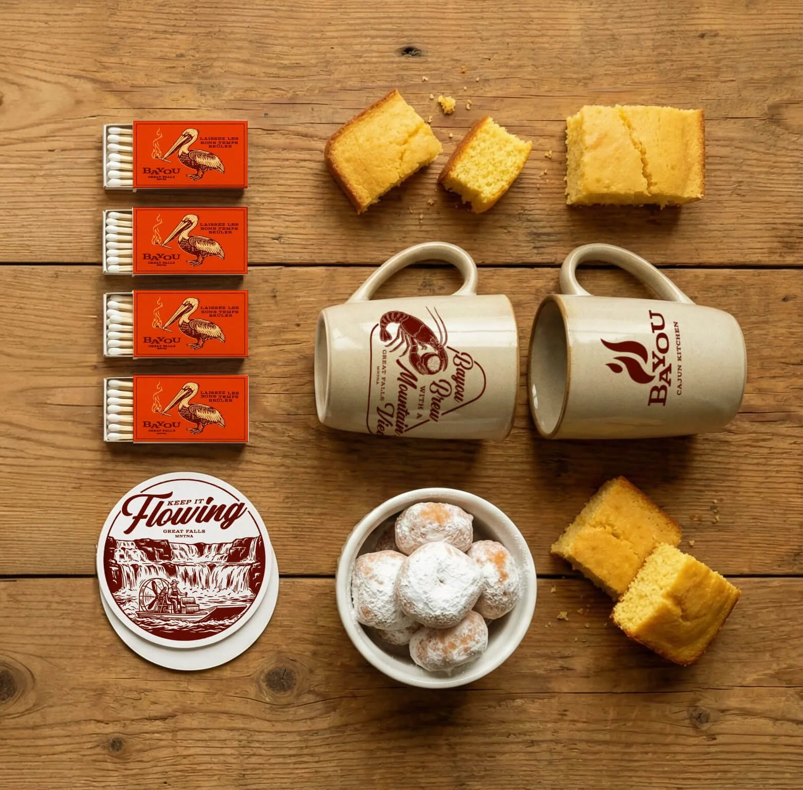 Every physical object creates an opportunity to deepen the narrative. We designed custom ceramic mugs that feel substantial in the hand. An illustration of a crawfish holding a beignet creates a sense of place and moment. Coupled with phrase “Bayou Brew with a Mountain View” establishes the coffee as uniquely authentic. These mugs turn coffee service into a brand ritual.