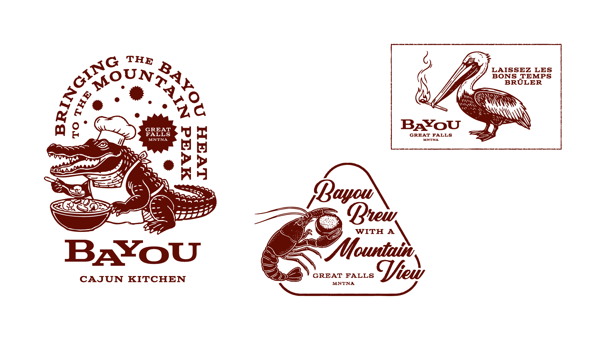 Fourteen years later the phone rang. Chef Black had moved west to Great Falls, Montana. The mountains were calling for heat. He wanted to resurrect Bayou in his new home. The challenge was to take a brand born in the Keystone State and adapt it for the Big Sky Country without losing its soul. We had one month to evolve the identity and expand it into a full expression of Cajun lifestyle.